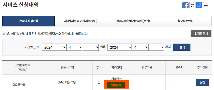 11) [서비스 신청내역]으로 창이 바뀌면 처리상태에서 "열람문서" 클릭